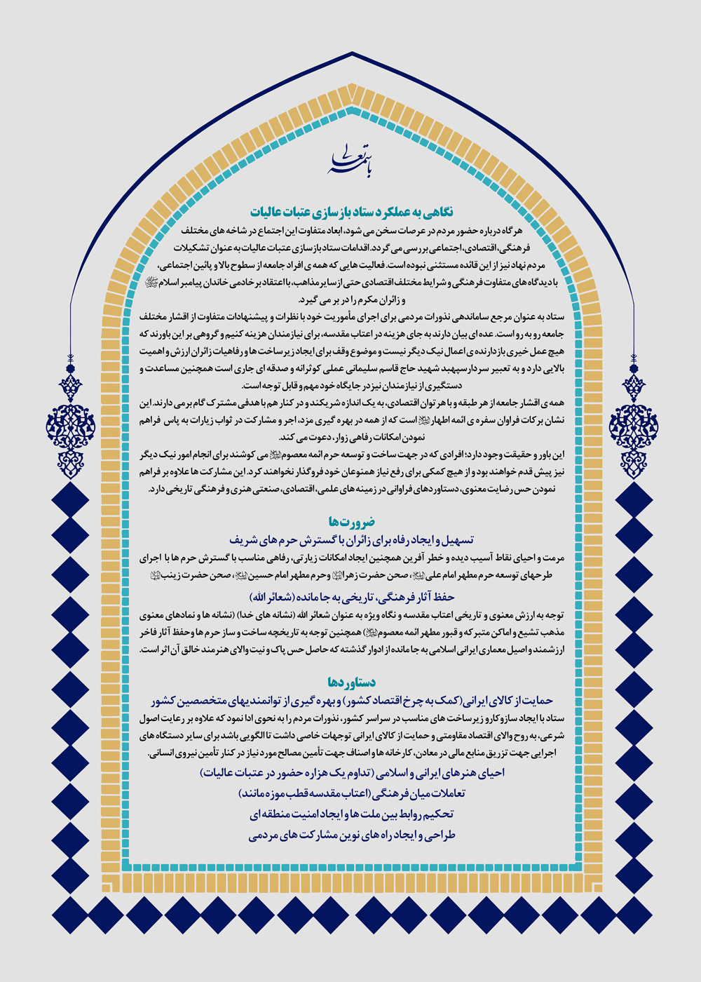 ۱- بازسازی و توسعه حرم های مطهر ائمه معصومین علیهم السلام و رسیدگی به اماکن مذهبی در کشور عراق ودیگر کشورها